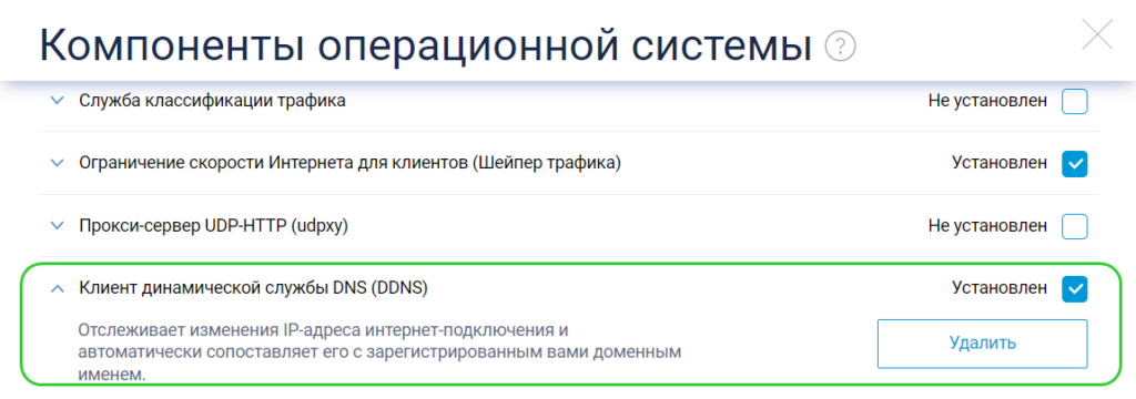 2. После установки компонента (Внимание! В момент установки производится обновление системы, поэтому рекомендую на всякий случай согласиться на сохранение резервной копии в момент обработки) закладка DDNS появится в разделе Сетевые правила -> Доменное имя. Причем сразу отмечаю, что службы не мешают друг другу и если у вас (как и у меня) настроен доступ с помощью KeenDNS, то вместе они будут работать параллельно.