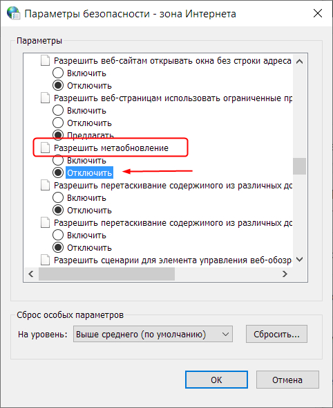 И так, чтобы отключить метаобновление, нужно открыть «Панель управления» (это метка «три точки» в правом верхем углу браузера) → «Другие инструменты» → «Параметры браузера» и в открывшемся окне перейдите на вкладку «Безопасность». В предлагаемом списке зон выберите «Интернет» и нажмите кнопку «Другой» внизу окна. В списке «Параметры безопасности — зона Интернета» для параметра «Разрешить метаобновление» поставьте отметку «Отключить» и нажмите «OK». В окне «Свойства: Интернет» нажмите «Применить».