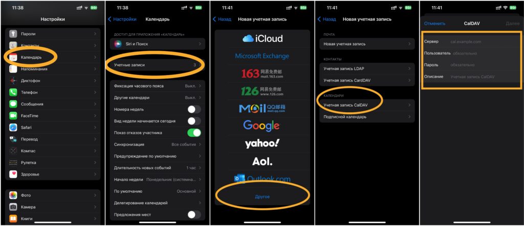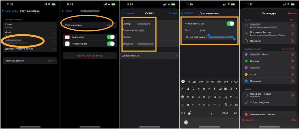 Ну а в iOS на iPhone собственно настраивать-то всё проще простого Настройки – Календарь – Учётные записи – Добавить учетную запись – Другое – Учетная запись CalDav. Вводите имя своего сервера (понятное дело логин – пароль своей учётки, ну и имя для этого соединения. При успешном соединении система скажет вам что все в порядке, синхронизация установлена и после этого в интерфейсе самого календаря я имею в виду в приложении в IOS вы сможете уже выбрать, что именно из вашего календаря показывать, может быть что не показывать и всё остальное.